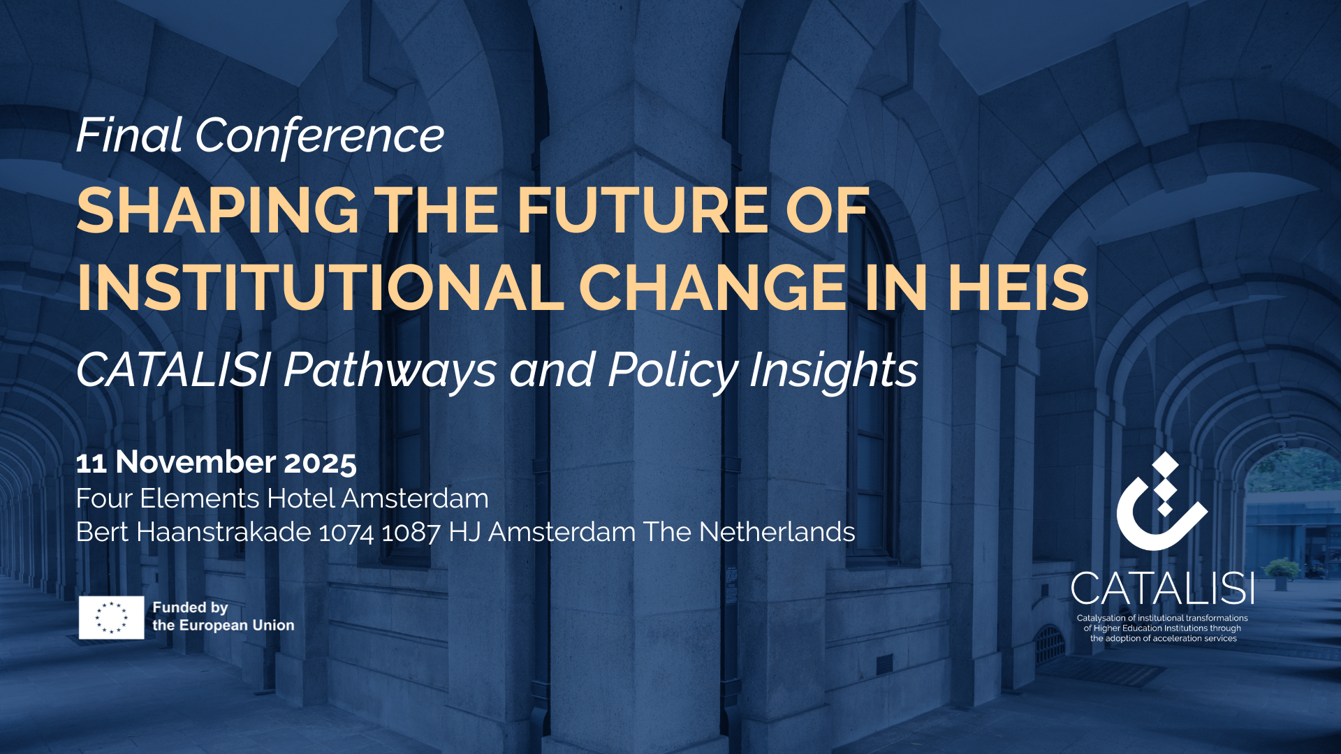 The Final Conference of the CATALISI project will be held on 11 November 2025 at the Four Elements Hotel in Amsterdam. This one-day event will bring together policymakers, researchers, university leaders, and innovation stakeholders to reflect on the progress made and explore what lies ahead for systemic transformation in Higher Education Institutions (HEIs).